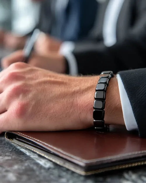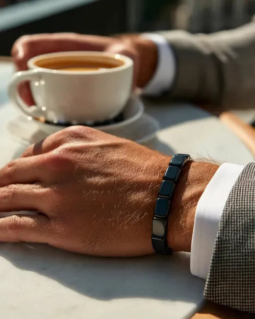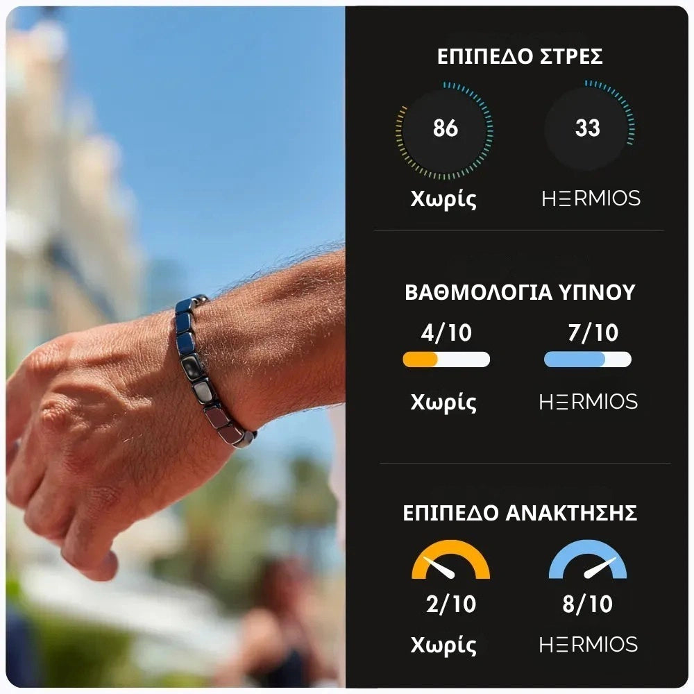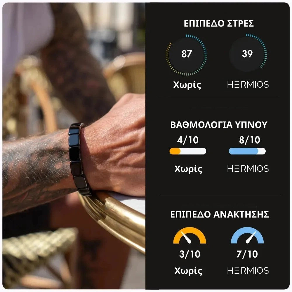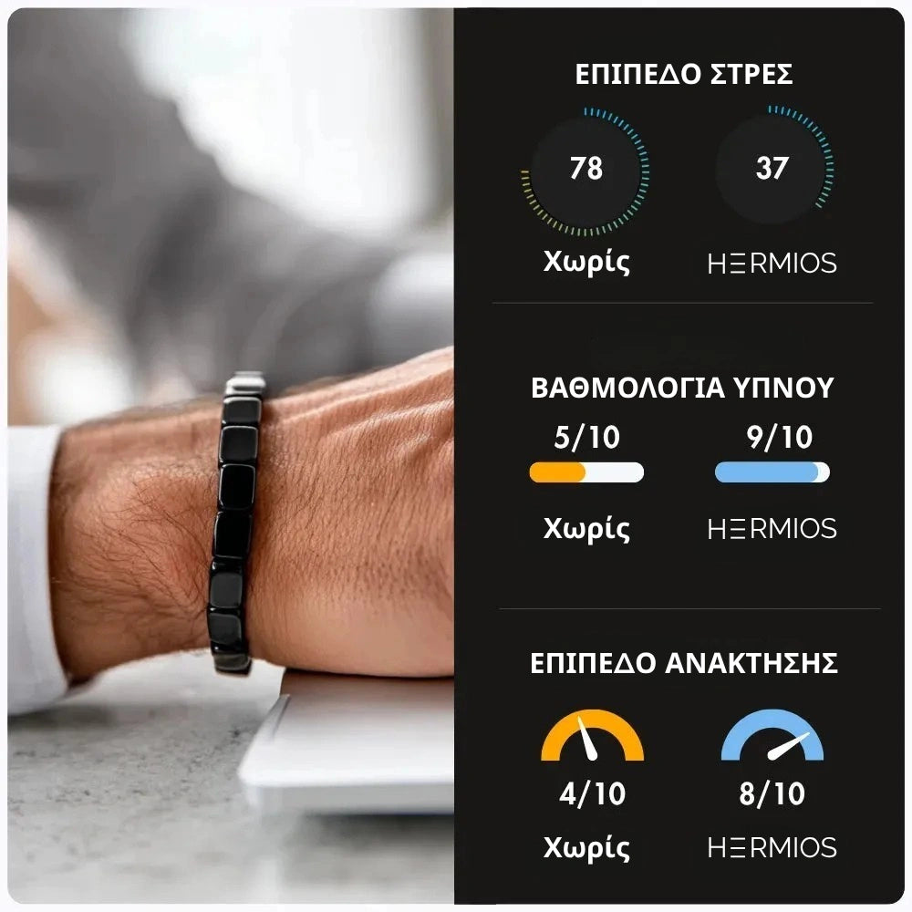 Το βραχιόλι Hermios σε βοηθά να επανενεργοποιήσεις την ανδρική ενέργεια, τη συγκέντρωση και την αυτοπεποίθηση — με ένα απλό καθημερινό τελετουργικό. Χωρίς χάπια. Χωρίς παρενέργειες. Χωρίς υπερβολές ή τεχνάσματα.